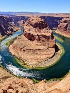 Net buiten Page ligt Horseshoe Bend, de hoefijzervormige bocht in de Colorado River op zo’n 300 meter hoogte. Parkeren kan op zo’n 1,2 km afstand van het uitzichtpunt. Dit kan een pittige wandeling zijn bij een temperatuur van rond de 45 graden maar desondanks is het geweldige uitzicht meer dan de moeite waard.